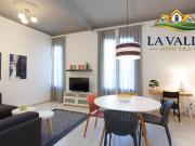 ...porta-borse Ampio soggiorno con tavolo da pranzo, TV, poltrona, divano letto matrimoniale Cucina attrezzata con frigorifero/freezer, lavastoviglie, forno Bagno completo con doccia, bidet e lavatrice Camera da letto matrimoniale di circa 20 mq con gra...